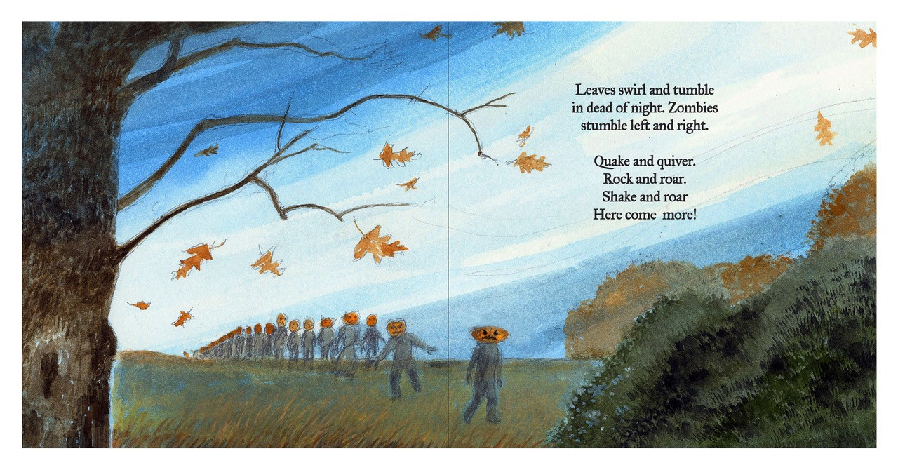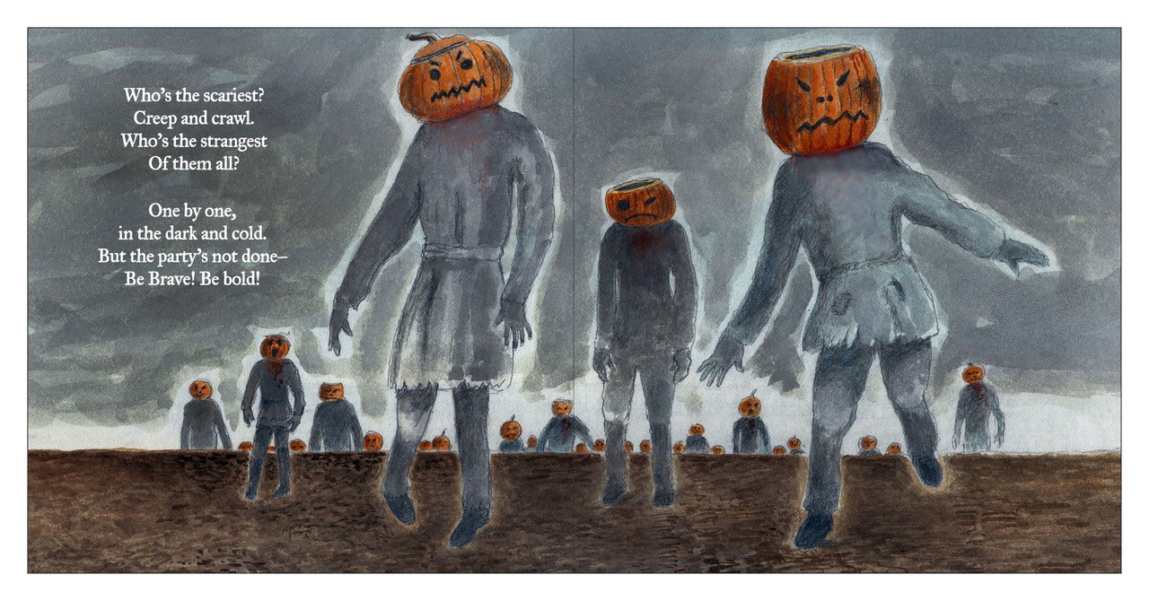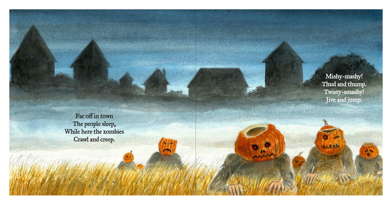 "Fear and fright!/ Brag and boast!/ On Halloween night/ who's got the most?" Following a spread showing a sun-kissed pumpkin patch at dusk, this Halloween extravaganza from collaborators Burleigh and Minor presents a parade of comically ugly, jack-o'-lantern-headed zombies lumbering across its pages. Rhyming lines introduce the figures: "First in line is/ Drizzle-Mouthed Drumpkin," who drools and carries a pitchfork; "Right behind is/ Zipper-Toothed Zumpkin," whose carved face sports one closed eye and a saw-toothed jaw. The humanoid beings, portrayed with tan hands, are clothed in ragged, alternatingly gray and black clothing that occasionally bears rust-hued traces. Marching across the handsome autumn countryside, the text asks readers to weigh in: "Who's the scariest?/ Creep and crawl!/ Who's the strangest/ of them all?" Though language warns readers to "beware, be wise!" the procession reads as more inviting accounting than genuine threat, especially as the parade winds down into a graveyard snooze.
