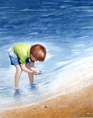 In this beautiful story, a boy from the mountains asks his mother to describe what the seashore looks like. In order to achieve this task, the author presents a descriptive poem that takes the reader on an imaginary sensory adventure. Zolotow effectively describes the colors, sounds, and sights of the seashore including watching the sun break through the morning mist, picking up shells at the water's edge, and listening to the sounds of the wind and waves. Detailed illustrations perfectly depict the activities enjoyed during a visit to the beach.